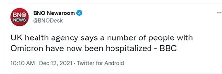 Note: Given the absolute avalanche of Omicron tweets, it becomes difficult to differentiate the signal from the noise. If we assume an organization is manipulating the conversation to trick people into thinking Omicron is mild and Omicron is in fact not mild, there will be some useful idiots mixed up with the bad actors. These are people that have been mislead by others into believing Omicron is mild.